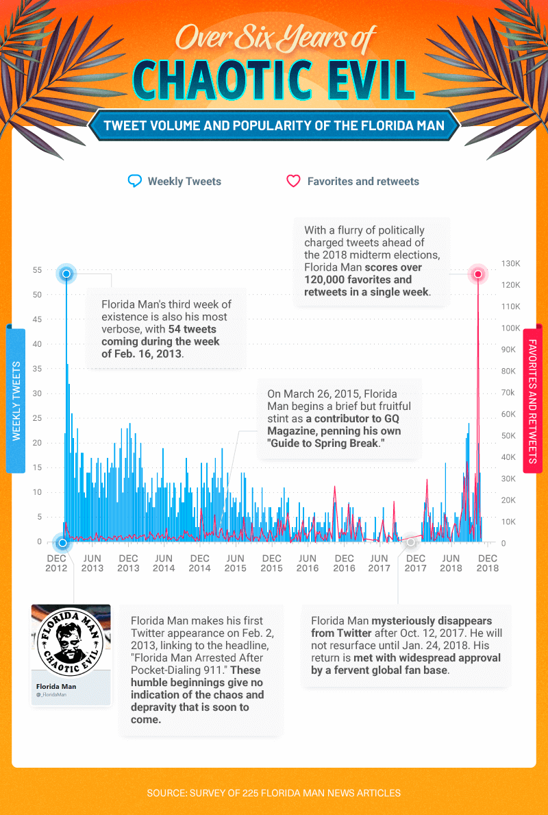 Hiaasen’s novels had already enchanted the public for decades when a new Twitter account popped its head out of the swamp on Feb. 2, 2013, linking to an article on Fox News and inauspiciously tweeting, “Florida man arrested after pocket-dialing 911.” By the evening of Feb. 8, @_FloridaMan had tweeted 16 more times and was the subject of Slate’s “Follow Friday.” The brief profile closed by saying, “… we can never have enough ways to take Florida’s crazy pulse, so we welcome Florida Man to the fray. We expect he’ll keep busy.”