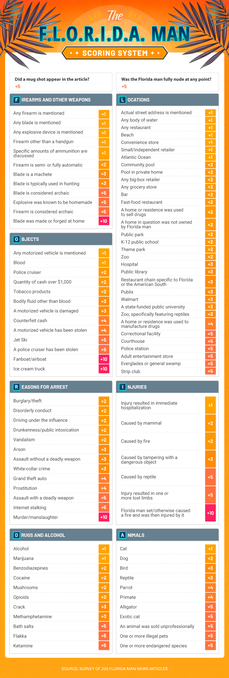 This was rigorous, important work that brought quantitative firepower to bear on a seemingly unsolvable problem – what exactly makes The Times’ wedding section so ridiculous? With the F.L.O.R.I.D.A. Man system, we aim to bring this same depth to analyzing the world’s worst superhero. A full description of our research methodology and the scoring system appears in the methods section below, but there are seven basic categories common to nearly every true Florida Man article ever written: