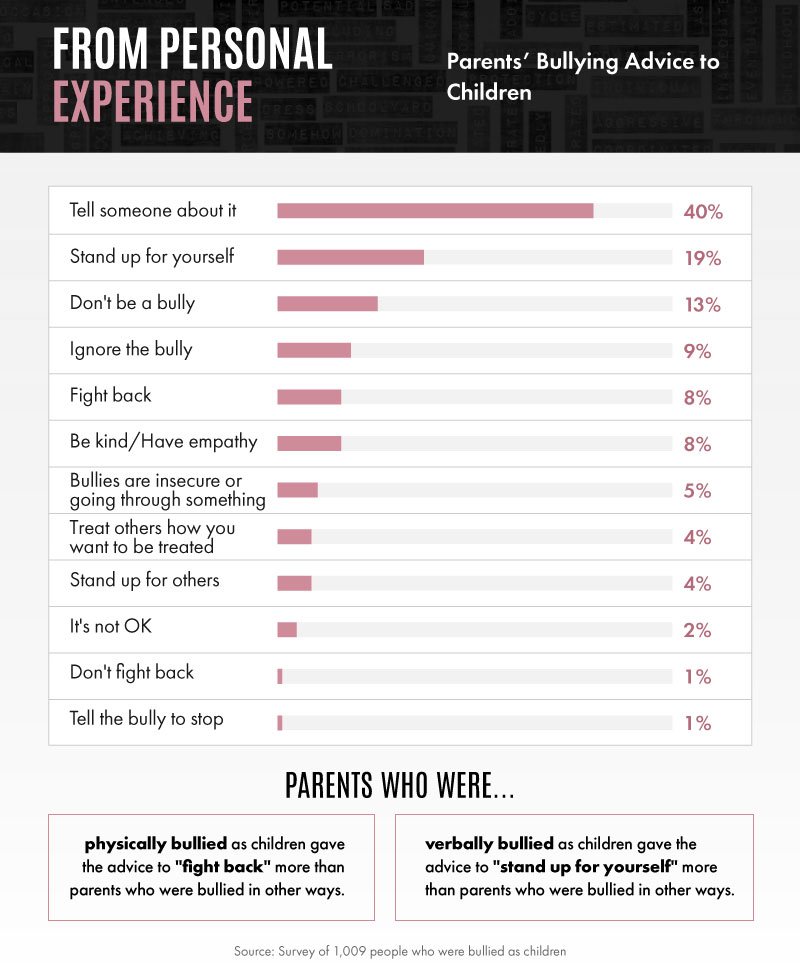 When it came to parents’ bullying advice to their children – based on their own experiences with childhood bullying – “ignore the bully” was not a popular response. Empathy for children who inflicted this kind of damage was even more scarce, as no more than 5 percent of parents wanted their children to believe bullies were just insecure or “going through something.