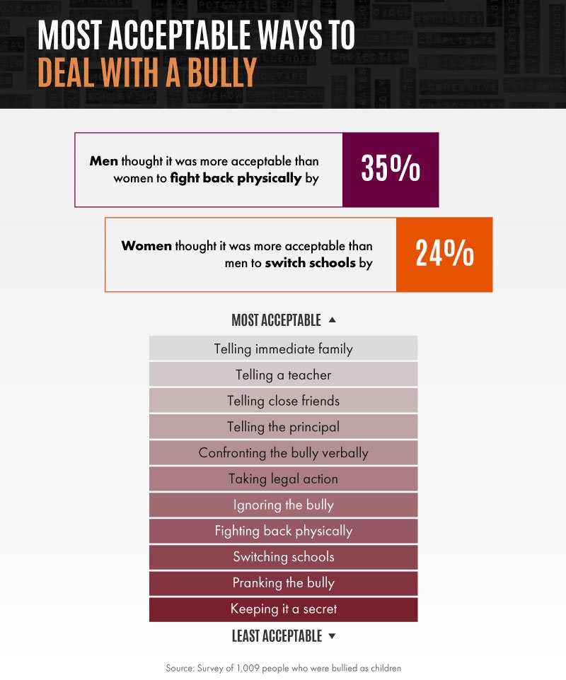 Both men and women ranked telling an immediate family member as the most acceptable way to deal with a bully. Telling a teacher or close friend was also seen as acceptable responses.