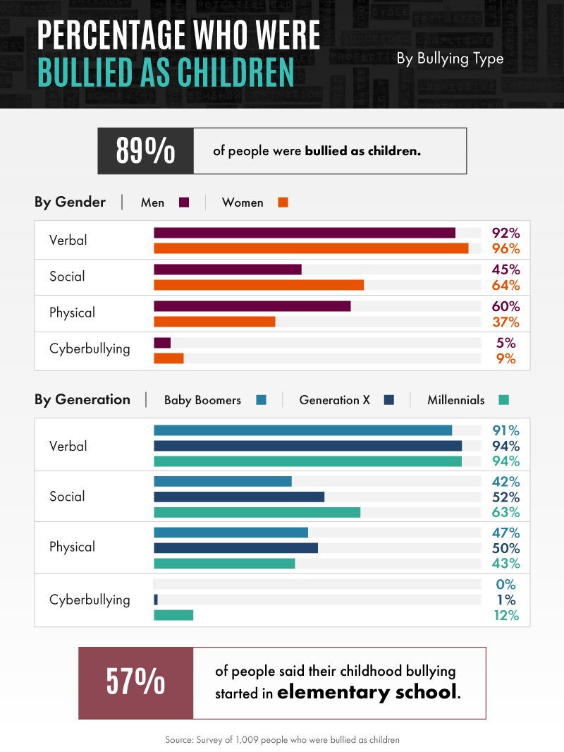 In most cases, the hitting, kicking, pushing, or pinching associated with these attacks came from classmates. Still, physical attacks don’t exclusively happen at school. Nine percent of men were bullied by cousins and 21 percent of women were physically bullied by their father.