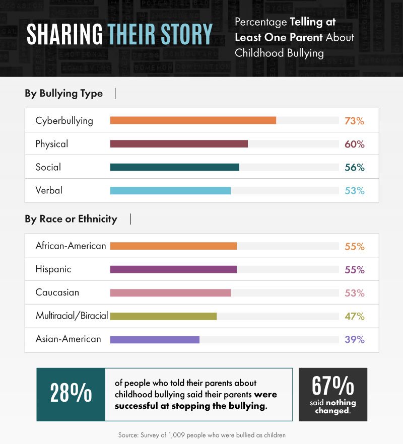 Despite the risk, children aren’t always comfortable opening up to their parents about bullying. In fact, only 39 percent of Asian-American and 47 percent of multiracial or biracial adults said they shared the details of their bullying with at least one parent.