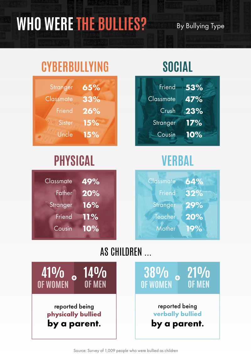 While physical and verbal bullying were more likely to come from classmates, 20 percent of people who experienced physical bullying as children said the abuse came from their father. Thirty-two percent experiencing verbal bullying said the actions came from a friend and 1 in 5 said the verbal abuse came from a teacher instead.