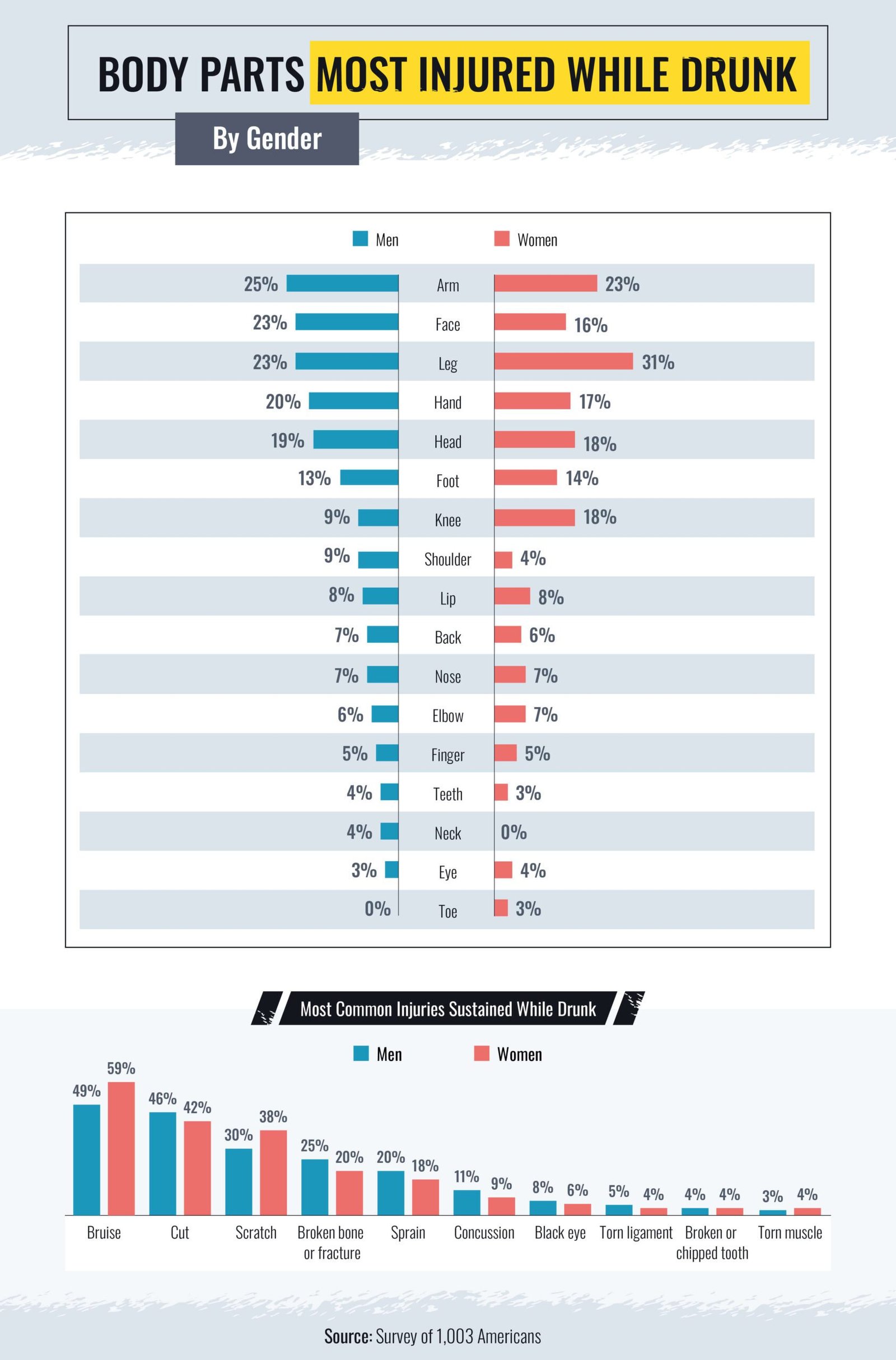 When people have had one too many, their extremities seem to become liabilities. Arms and legs made the top three for most-injured body parts among tipsy folks from both genders, with 31 percent of women having hurt their leg and 25 percent of men having sustained an arm injury.