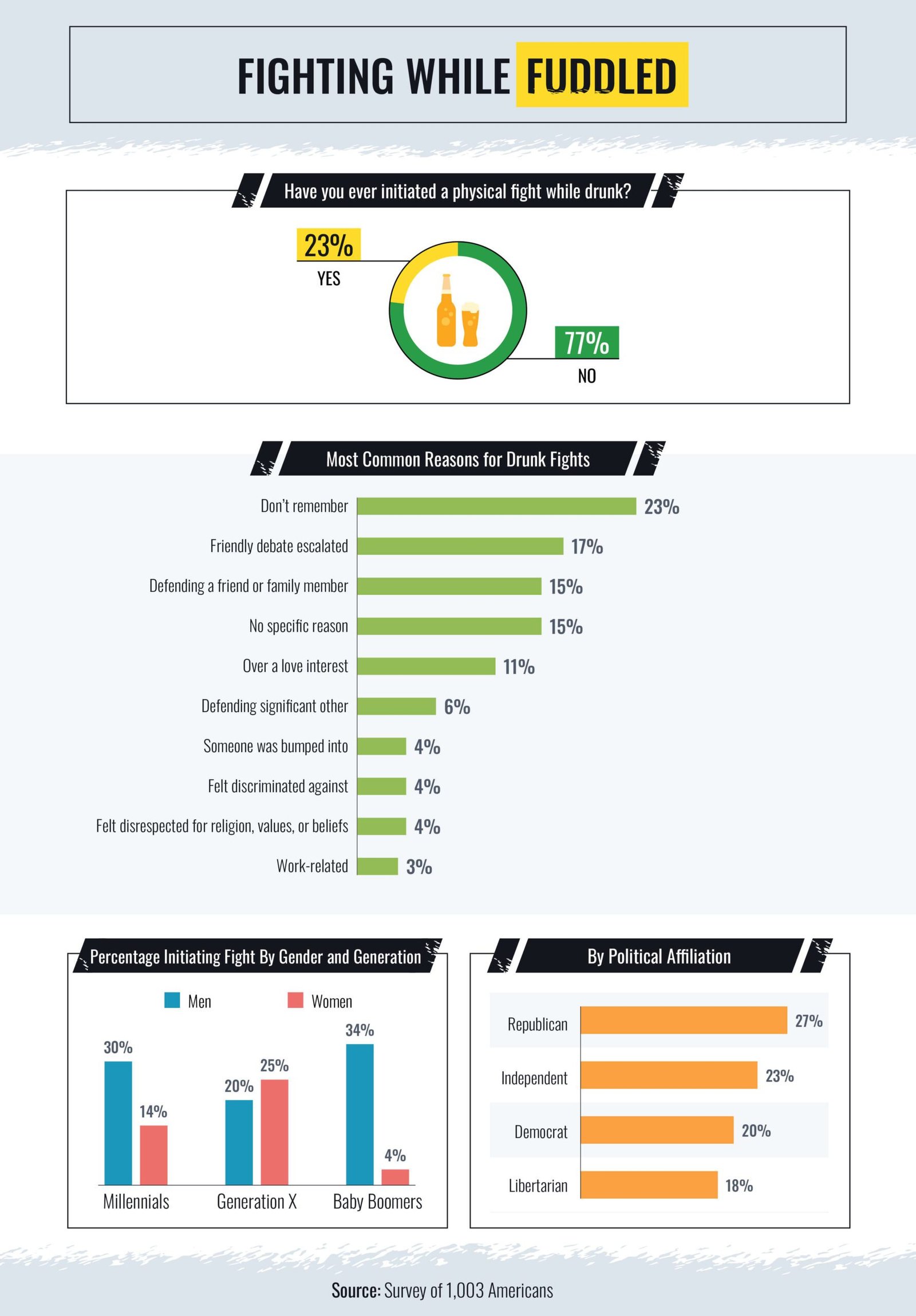 While millennial- and boomer-aged men were the culprits behind the majority of their generation’s boozy brawls, the women of Generation X started more fights than their male counterparts. Slicing the data politically, Republicans were the first ones to swing a punch 27 percent of the time, compared to 23 percent of Independents, 20 percent of Democrats, and 18 percent of Libertarians.